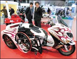 زوار يابانيون يشاهدون الدراجة النارية تي ماكس من إنتاج شركة يامها وهي مجهزة بحيث يمكنها حمل كرسي متحرك، وذلك في معرض للدراجات النارية بطوكيو.
