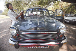 سائق يقف بجوار سيارته في الهند. والسيارة من نوع «أمباسادور» صنعتها شركة «هندوستان موترز» بمدينة كلكتا الهندي. كان هذا الطراز من السيارات يسيطر على 70% من مبيعات السيارات في الهند في فترة ازدهارها في السبيعنات من القرن الماضي. وتشهد الآن نمواً في المبيعات بعد فترة من الركود.