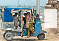 إسلام أباد، باكستان: أطفال باكستانيون يلعبون على سيارة بثلاثة إطارات أمام منزلهم الطيني في إسلام أباد. وتعد هذه السيارة وسيلة النقل الأكثر انتشارا في مناطق الريف الباكستاني (أ.ف.ب) |