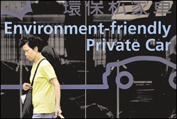 مواطنة صينية تمر أمام صالة لبيع السيارات خصصت لبيع السيارات الصديقة للبيئة فقط. يذكر أن الحاجة إلى الاعتماد على السيارات الصديقة للبيئة قد باتت ملحة في العالم أجمع بسبب تغيرات المناخ. أما الصين فتعمل على ذلك ربما لسبب آخر وهو التحضير للأولمبياد في العام المقبل، حيث تخيم على معظم المدن الصينية سحابات كثيفة من الدخان والأتربة.