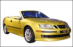 المكشوفة ديبرا كيلي رئيسة فرع شركة ساب في الولايات المتحدة تعرض موديل 2004 من السيارة ساب 93 وهي سيارة رياضية مكشوفة.