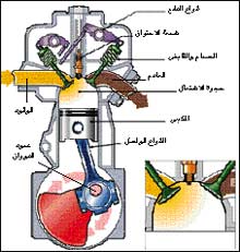 3 شوط الدوران: الانفجار الذي يحصل يدفع بعد ذلك المكبس إلى أسفل الاسطوانة ليدير عمود الدوران في الأسفل.