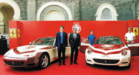 رئيس مجموعة تاتا الهندية للسيارات بجوار نائب رئيس شركة فيات الإيطالية يتوسطان سيارتين من نوع فيراري قبل بدء الرحلة الاستكشافية التي ستجرى في الهند وتستغرق 74 يوم. رويترز