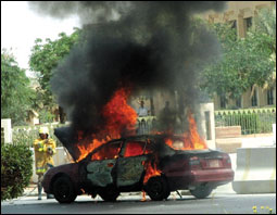 بريدة - أحمد السالمتمكنت فرقتا إطفاء وإنقاذ بالدفاع المدني ببريدة من إخماد حريق شب في سيارة مواطن من نوع دايو بطريق الملك عبدالله بحي الصفراء أمام مبنى إمارة منطقة القصيم، وقد أدى الحريق إلى إرباك حركة السير وعرقلتها قرابة ساعة إلا ربع، وقد هرعت فرق مرورية وأمنية إلى موقع الحادث لتنظيم حركة السير فيما باشرت فرقة الدفاع المدني موقع الحريق خلال خمس دقائق
