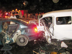 الرياض - خالد المضحي - معن الغضيةوقع حادث في طريق الخرج باتجاه الجنوب في ساعة متأخرة من الليل بين سيارتين إماراتية وسعودية مما أسفر عن وفاة السائق السعودي ومرافقه وإصابة شخص ثالث كان معهما. وأصيب 4 من الجنسية الهندية واثنان من الجنسية الباكستانية واثنان من الجنسية الإماراتية؛ وسائق السيارة الإماراتية. ونتج الحادث عن تجاوز السيارة السعودية لقواعد المرور