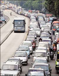 أقرت الحكومة الإندونيسية ميزانيتها لعام 2008 وزاد العجز فيها أكثر من المتوقع. وذلك بسبب الدعم المادي الذي قررت الحكومة منحه لقطاع الوقود للتغلب على ارتفاع أسعار النفط. الصورة من أحد شوارع جاكرتا العاصمة حيث الازدحام الشديد أ.ف.ب