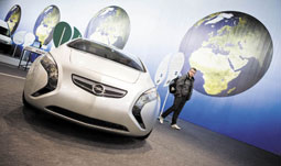 احتضنت مدينة بوزان في بولندا معرض التقنية في حماية البيئة الذي نظمته الأمم المتحدة على هامش مؤتمر التغير المناخي. وفي الصورة زائر يشاهد سيارة أوبل فلكستريم هجينة.