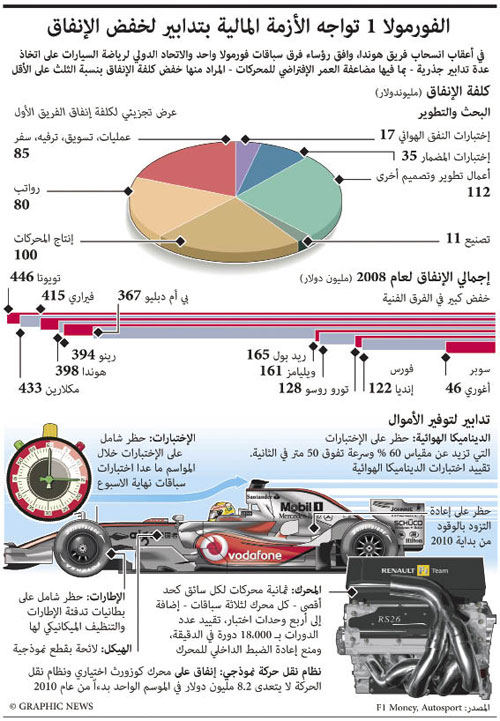 باريس - (أ.ف.ب):اعتمد المجلس العالمي للاتحاد الدولي لرياضة السيارات، خلال اجتماعه في موناكو، (بإجماع جميع الفرق) عددا من الإجراءات الهادفة لتحقيق خفض كبير في تكاليف المشاركة في سباقات سيارات الفورمولا واحد عام 2009م. وأول هذه الإجراءات يتعلق بالمحركات التي يجب أن تدوم لثلاث سباقات متتالية على ألا يستخدم السائقون أكثر من 8 كتل دفع في الموسم الواحد 4