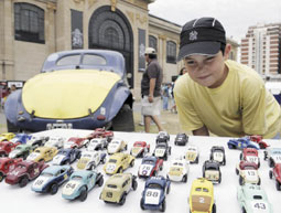 طفل يشاهد مجموعة من ألعاب السيارات التي تمثل الموديلات المختلفة المشاركة في سباق سيارات بوينس أيرس – كاراكاس.