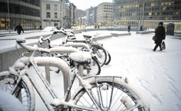 تساقطت الثلوج في أكثر من بلد أوروبي مما أدى لإغلاق العديد من الطرقات ووقوع كثير من حوادث التزحلق والاصطدام. الصور لموقف دراجات وقد كستها الثلوج