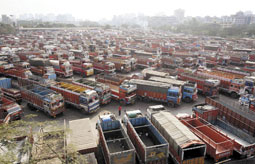 شاحنات مكدسة في ميدان بمدينة مومباي الهندية إثر تنفيذ عشرات الآلاف من سائقي الشاحنات إضراباً شمل كل أنحاء الهند. وجاء تنفيذ الإضراب بعد أن فشلت المفاوضات التي جرت بين ممثلي السائقين والمسؤولين الهنود في التوصل إلى اتفاق، ما يهدد بارتفاع أسعار المنتجات الغذائية وغيرها من السلع