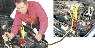 تأكد من أن أغطية فتحات البطارية محكمة الإقفال، وأن مستوى السائل في البطارية عند علامة الحد الأدنى للمنسوب أو فوقها وتأكد أيضا أن السيارتين غير متلامستين. وأن مفتاح التشغيل والنظم الكهربائية كالمذياع وغيرها مغلقة. وأن النظم في كلتا السيارتين ذات فولطية واحدة.