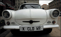 سيارة من نوع ترابانتي تقف أمام متحف الجاسوسية بألمانيا في عرض لهذا النوع من السيارات الذي كان منتشراً في ألمانيا الشرقية. ويحتفل الألمان هذه الأيام بتحطيم جدار برلين الذي كان يفصل دولتهم إلى دولتين شرقية وغربية. ( أ.ف.ب) |