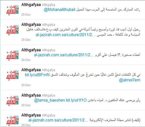 أنشأت (الثقافية) صفحتها الرسمية على موقع تويتر الإلكتروني؛ الذي يقدّم خدمة التدوين المصغر ويسهم في تقريب المسافة بين (الثقافية) وقرائها وكتّابها على حد سواء، وتقدّم الصفحة حالياً روابط للمقالات، التقارير، الأخبار واللقاءات التي تحويها (الثقافية) أسبوعياً وتصل لقرائها ومتابعيها مطلع كل خميس، مشيرة إلى كتّابها الفاعلين على تويتر لمنح المتابعين فرصة التواصل المباشر معهم،كما أنها حرصت على