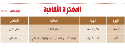 نظرًا لإجازة منتصف الفصل الدراسي الثاني فسوف تتتوقف المجلة الثقافية الخميس القادم والذي يليه (22 و 29 مارس) وتستأنف الخميس الذي يليهما (5 أبريل) بحول الله، وسيحل محلها الملحق الثقافي داخل الصحيفة كالمعتاد.