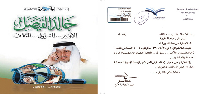 بعث صاحب السمو الملكي الأمير خالد الفيصل -وزير التربية والتعليم- خطاب شكر إلى سعادة رئيس التحرير الأستاذ خالد بن حمد المالك.. وذلك بعد أن تلقى سموه 500 نسخة من كتاب: (خالد الفيصل: الأمير.. المسؤول.. المثقف) الذي أصدرته مؤسسة الجزيرة للصحافة والطباعة والنشر ضمن إصدارات الجزيرة الثقافية.