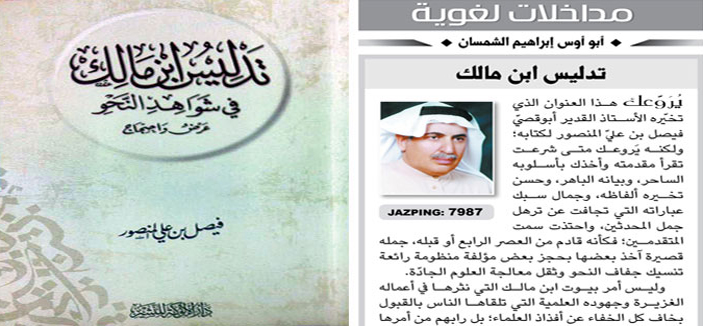 قرأت في صحيفة الجزيرة، العدد15157، ليوم السبت 28 من جمادى الأول 1435هـ الموافق لـ29 من مارس 2014م، ص29؛ مقالة للدكتور أبي أوس إبراهيم الشمسان عنوانها «تدليس ابن مالك»، عرض فيها كتاب «تدليس ابن مالك» لفيصل بن علي المنصور، وأيد ما ذهب إليه فيه.