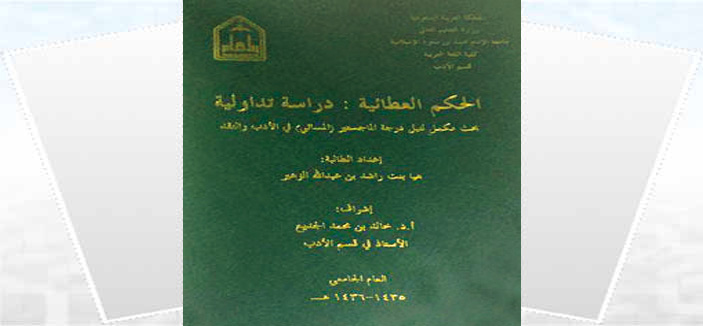 تحليل الخطاب الصوفي وفق المنهج التداولي كان موضوع رسالة الطالبة هيا راشد الزهير للماجستير. وقد حصلت الطالبة على تقدير امتياز مع مرتبة الشرف الأولى، وتوصية بطباعة الرسالة التي كان عنوانها (الحكم العطائية دراسة تداولية). الرسالة تمت مناقشتها في جامعة الإمام محمد بن سعود الإسلامية بالرياض، وتكونت لجنة المناقشة من: الأستاذ الدكتور خالد بن محمد الجديع الأستاذ في قسم الأدب مقرراً. والأستاذ الدكتور صالح بن الهادي رمضان أستاذ اللسانيات في جامعة منوبة بتونس عضو هيئة التدريس في قسم الأدب بجامعة الإمام عضواً. والدكتور عبدالكريم عبدالله العبدالكريم من قسم الأدب عضواً.