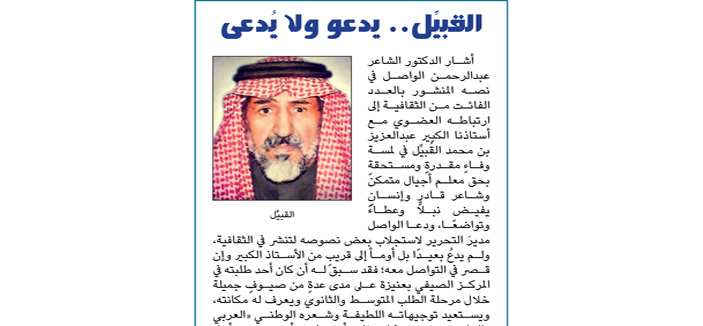 وصلاً لما نشرته الثقافية حول تواري الشاعر الأستاذ عبد العزيز بن محمد القبيِّل عن الساحة بعث أبو محمد بالرسالة الشعرية التالية: