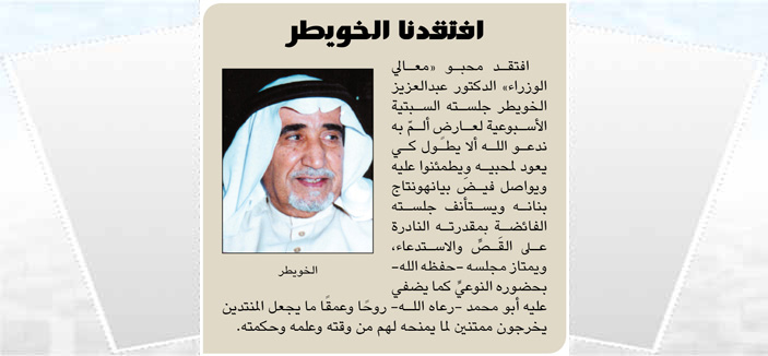كانت المجلة الثقافية قد كتبت عن الفقيد الكبير الدكتور عبدالعزيز الخويطر في العدد الماضي خبراً تشير فيه إلى افتقاد محبيه مجلسه العامر إثر عارض صحيّ ألمّ به .. وشاءت إرادة الله أن ينتقل إلى جوار ربه في اليوم التالي لصدورها، وهو الحفي بها الحريص على متابعة (الجزيرة) والكتابة فيها.