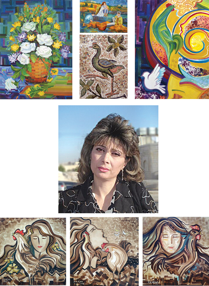 ثم كانت محاولة للتعمق من خلال الموروث الثقافي المحلي المتمثل بلوحة الفسيفساء وطريقة رصف أحجارها ومظهرها البصري الناتج عن رؤية سطح وحيد لمكعباتها، فكانت الفسيفساء مفردتها التالية (علماً بأنه كان لها تجارب في الفسيفساء أثرت تجربتها في اللوحة).
