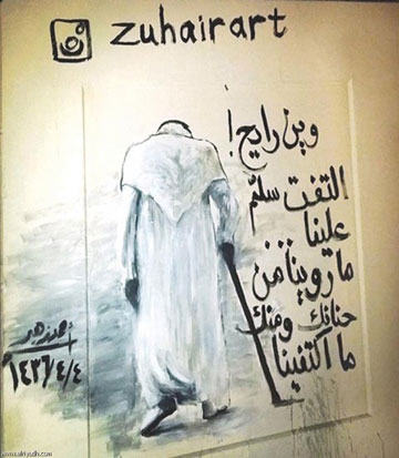 امتلأت القلوب حزنًا لفراقه، وتناقلت الصحف والمواقع صوره وإنجازاته، واختلفت أساليب رثائه بين شعر ونثر ورسم. ألم فراقك أيها الأب الحنون دفع كثيرًا من أبنائك لتجسيد حبك، كلّ على طريقته الخاصة ألمًا وحزنًا وبكاء. وجاءت جدارية الفنان أحمد زهير أصدق وأنبل رثاء يقدمه الأبناء لوالدهم الفقيد -رحمه الله-. حملت هذه الجدارية ملامح جمالية فنية وإنسانية صاغت خطابًا جماليًا مختلفًا، وخلقت في نفس مشاهديها من جميع الأعمار والثقافات مشاعر فياضة تكشف عن تجربة إنسانية عميقة ستحاول هذه الأسطر قراءة بعضًا من جوانبها.
