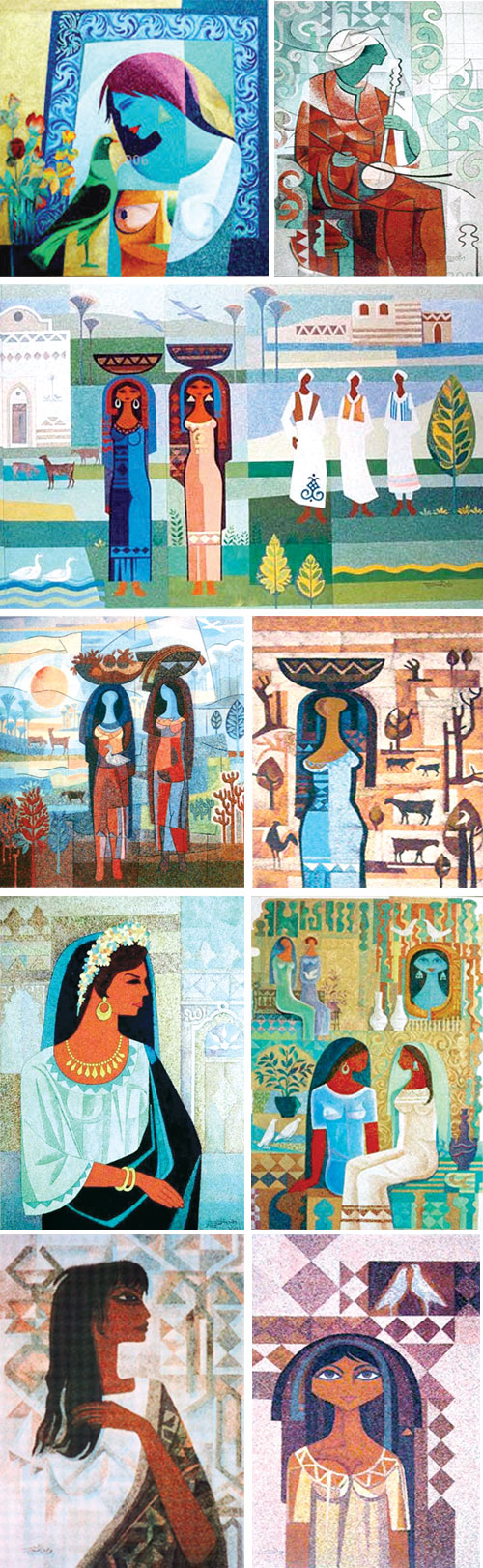 وفيق المنذر رائد الفن (الجرانيوليت) الخامة التي أصبحت ملازمة له وجزءاً من عطائه.. خلال حياته الفنية الذي رحل في عام 2014م بعد ان ترك أرثاً بصرياً يحمل بصمته وهوية وتراث وطنه.. كان يرحمه الله يلتقط مواضيعه من محيطة الشعبي من عادات وتقاليد وأنماط حياة الريف المصري الأصيل، موثقاً ومسجلاً حركات وسكنات ذلك المجتمع المشبع والعاشق للعمل الذي تحول إلى عشق الفنان لهذا الواقع فاستلهمه في أعماله الفنية مانحاً المرأة مساحة كبيرة من تلك الأعمال ببساطتها وجمالها وهيئتها التي تشمل الملابس الشعبية وربطها بالتراث من خلال الرموز التي تحيط بها في كل لوحة وكأنها جزء من تاريخ مصر وثقافته المرأة ودائماً في قلب اللوحة، كما أشار الفنان أ. د. أحمد نوار قائلاً في قراءة لأعمال الفنان وفيق أن اللافت للنظر والمثير للدهشة والتأمل في لوحاته الأخيرة هي ثلاثيات المرأة في اللوحة الواحدة باستثناء عدد قليل من اللوحات بين المرأة منفردة أو امرأتين وعند جمعهم نجدهم يساوون ثلاثة أيضاً، فنجد في بعض اللوحات وحدة النبات ووحدة الطيور، فسمة ما تجمع هذه الوحدات المتكاملة نحو بناء تشكيلي محكم في المجموعة الأخيرة التي استطاع المنذر من خلالها -باقتدار- اختزال الجسد الأنثوي ببراعة وبتحديد خطى أسود في حوار متصل ومتنوع وبإيقاع موسيقي مثير للاستماع كسيمفونية الصورة الذهنية الخالصة والتي ندركها ونحسها بالشعورية الداخلية ولا نراها بالعين.. فهنا نشاهدها ونسمع في آن واحد، وفي المجموعة الأخيرة يظهر ما هو تجريدي مطلق مبتعداً كل البعد عن تجربة الفنان الطويلة، فهل هي نافذة جديدة ومرحلة تحوّل تمتد إلى آفاق أكثر اختزالاً لشفافية الحياة والروح الشعبية التي تميز بها؟! ويتعامل المنذر مع تقنية في غاية الصعوبة، فالمواد رملية ومعالجتها تحتاج لخبرة وحكمة وصبر وقدرة على صياغتها بهذا القدر من الشفافية والصفاء الذاتي الذي يشع طاقة أقرب ما تكون إلى الضوئية بفعل المادة وجيناتها المتفاعلة الدافئة، والضوء الذي يصنعه المنذر هو ضوء جيني يتراص واحداً بجانب الآخر يتحرك ويلتئم ويمتد ويتماسك في جسد الفضاء الذي تحركه درجات التجانس اللوني والتباين في نفس الوقت ولكن في حالة إعمال للطاقة اللونية وموجاتها الحية بفعل الضوء الآتي إليها، وعندما تتحرك الخلية الضوئية في جسد المرأة تكشف هنا عن مدى انصهارها في تقاسيم البناء التشريحي الذي اعتمد عليه المنذرعلمه وإحساسه التشريحي للجسد في توازن وحركة، ولم يتوقف ضوء جينات الجرانيوليت عند هذا الحد كفاعل تعبيري في أعماله بل امتدت الرمزية إلى كثير من الأعمال فالقمر، والطائر، والنبات، والشمس.. كلها مفردات دالة على مخزونه الإنساني والاجتماعي والوطني، فالحالة الشعورية عند المنذر فياضة تنضح في كل أعماله، ويحسب له سيطرته على تقنياته فدقة الفنان وعلمه بتكنولوجيا فنه جزء لا يتجزأ من الإبداع الفني وأخلاقيات الفنان، فالفنان المبدع الحقيقي هو الفنان الذي يمتلك فكره ورؤاه وأدواته في آن واحد فضوء المنذر في جمال نسائه.