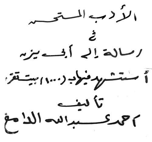 «لما قررت كتابة رسالة أدبية إلى من يجل ذكره عندما يدور الحديث عن أدباء بلادنا المعاصرين، أجريت قرعة على أسماء أدباء قائمة لا بأس بها من حيث عدد الأصدقاء الأدباء فخرج اسمك الكريم بالقرعة» مخاطباً إياه بكنيته في جميع مقاطع الرسالة التي استشهد فيها رحمه الله بألف بيت تقريباً!