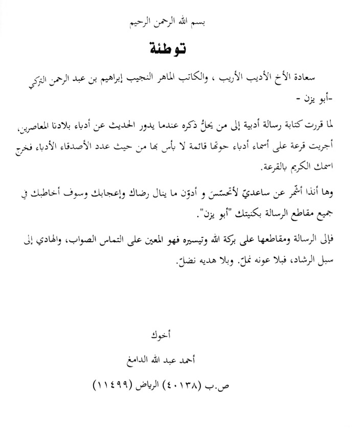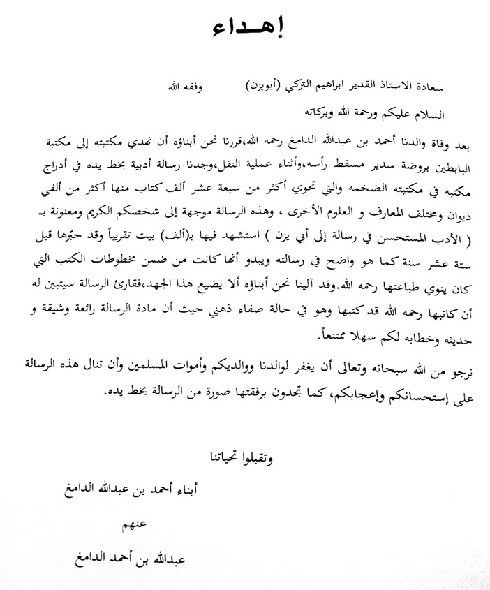 بدأت الحكاية عندما قرر أبناء الأديب والكاتب الأستاذ أحمد بن عبدالله الدامغ رحمه الله 1351-1435هـ إهداء مكتبته الثرية إلى مكتبة البابطين بروضة سدير مسقط رأسه، ليفاجأوا برسالة أدبية بخط يده في أدراج مكتبته - التي وفقاً لأبنائه - تحوي أكثر من سبعة عشر ألف كتاب منها أكثر من ألفي ديوان ومختلف المعارف والعلوم الأخرى، موجهة إلى الدكتور إبراهيم التركي مدير التحرير للشؤون الثقافية بعنوان «الأدب المستحسن في رسالة إلى أبي يزن»!