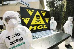 مجموعة من أعضاء جمعية (السلام الأخضر)، وهي جمعية عالمية معروفة بنشاطها في الدفاع عن البيئة ومكافحتها التلوث الصناعي بكافة أشكاله المختلفة، يرفعون مجسماً لكمبيوتر محمول أمام مقر شركة(HCL) الهندية في العاصمة نيودلهي. |