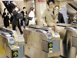 وفي الصورة سيدة يابانية تقوم بشراء تذكرتها لركوب قطار المترو بالعاصمة اليابانية طوكيو من خلال بطاقتها