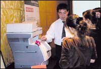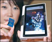 المهندسة الإلكترونية ساتوكو كوبو الموظفة لدى شركة ما تسوشيتا العالمية والمتخصصة في الصناعات الإلكترونية تستعرض منتج شركتها الجديد من مشغلات الكتب والبيانات الرقمية خلال ........