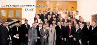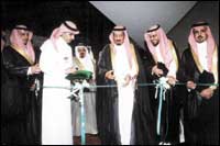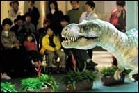 مجموعة من زوار المعرض الأكاديمي لبيئة الأرض يتابعون الاستعراض الخاص بإحدى الديناصورات الآلية في بهو المعرض ، زهذا الديناصور من نوع تراينوصور وهي إحدى الانواع المنقرضة لهذه ........