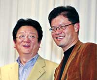 أحد الشركاء المؤسسين لمحرك البحث العالمي ياهوو (Yahoo) السيد جيري يانغ (يمين) وإلى جانبه رئيس شركة ياهوو في اليابان السيد ماساهيرو اينو خلال المؤتمر الصحفي الذي أقيم في ........