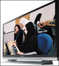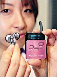 عارضة تابعة لشركة ماتسوشيتا اليابانية إحدى الشركات العملاقة في صناعة المنتجات الرقمية تستعرض آخر منتجات الشركة وهو عبارة عن مشغل صوتي رقمي يعد الأصغر في العالم.