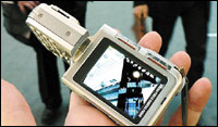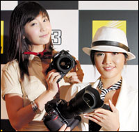 عارضتان كوريتان تقدمان عرضا لكاميرا نيكون الرقمية الجديدة، الكاميرا D3 (أسفل) والكاميرا D300 (أعلى) في فندق بمدينة سول العاصمة، حيث تزمع الشركة اليابانية المنتجة للكاميرا إطلاقه في الأسواق العالمية في نوفمبر القادم