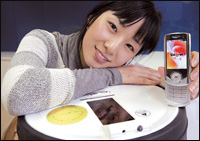 سيول - جمهورية كورياموظفة بشركة كيه.تي.إف (KTF) للهاتف الجوال في سيول تعرض جهاز جوال يمكنها عن طريقه تشغيل روبوت يؤدي عمل المكنسة الكهربائية. وبإمكان هذا الروبوت أيضاً إصدار صوت إنذار في حالة دخول شخص غريب بجانب أعمال التنظيف.