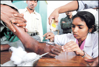 بوريرخال - بنغلاديشممرضة بنغلاديشية متطوعة تعالج رجلاً جرح في الإعصار الأخير الذي أصاب بنغلاديش بمساعدة ضوء الهاتف الجوال في قرية بوريرخال بجنوب بنغلاديش. وقد أدى الإعصار إلى تدمير عنيف ونتج عنه وفاة 3447 شخصاً وفقدان 2062 شخصاً.