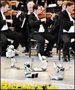 كما يظهر في الصورة فإن هذه الروبورتات الآلية لشركة سوني الإلكترونية والتي أطلق عليها اسم(QRIO) أو كوريو تقوم بأداء عدد من حركات الرقص على أنغام الأوركسترا في حفل أقيم بمناسبة افتتاح معرض تكنولوجي بمدينة ناغاكوتي اليابانية.