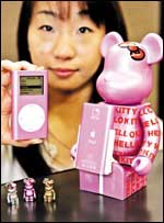 موظفة يابانية تستعرض آخر منتجات شركة(Apple) من أجهزة آي بود الرقمية(iPod) وأطلق عليها هيلو كيتي وَ ميني آي بود وهما مزودان بذاكرة سعة 6 غيغا بايت وقد تم عرض هذه المنتجات بقسم العرض الخاص بالشركة بمدينة طوكيو اليابانية، وزود هذا المنتج بعدد من الملحقات التجميلية والتي صممت على شكل دب وذلك لتعطي الجهاز ميزة جمالية تتوافق مع تصميمه هذا وسيعرض هذان المنتجان الجديدان في الأسواق بسعر قدر بـ 39000 ين (380 دولاراً أمريكياً).