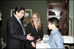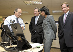 وزيرة الخارجية الأمريكية كونداليزا رايس ووزير الخارجية الأسترالي ألكسندر داونر (الثاني من اليسار) يتابعان مع مارك هيرد، المدير التنفيذي لشركة هيوليت باكارد الأمريكية (على اليمين) شرحا لتقنية جديدة لتخزين المعلومات من صنع الشركة. يسمح الجهاز الجديد بتخزين ألعاب