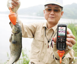 صياد كوري يعرض تقنيته الجديدة في صيد الأسماك باستخدام الجوال . فقد استغلت إحدى الشركات تشغيل الهاتف الجوال لعشق الكوريين الجنوبيين للجوال لاستخدامه في تحديد أماكن الأسماك بإعطاء إشارات حمراء.