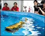 روبورت آلي على شكل سمكة بحرية يقوم بعرض أمام المصورين في غرفة العرض الخاصة لشركة متسوبيشي اليابانية، وكانت شركة متسوبيشي قد قامت بصنع أسمالك آلية صغيرة الحجم في السابق وتسعى إلى صناعة أسماك أصغر خلال الفترة المقبلة .