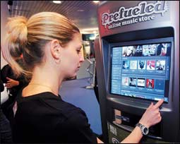 سيدة فرنسية بمدينة كان تقف أمام كابينة لبيع ملفات الأغاني عبر الشبكة العنكبوتية وهذه الكابينة ليست الوحيدة الجديدة في السوق. فقد ساعد التطور الهائل في التقنية على تسويق الأغاني عبر الإنترنت إلى أجهزة الجوال والكمبيوتر المحمول بعدة طرق الأمر الذي زاد في |