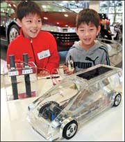 طفلان يابانيان يتابعان عن كثب نموذجاً اختبارياً لسيارة تعمل على خلايا الوقود وذلك في قاعة وكالة هوندا العالمية لصناعة السيارات بالعاصمة اليابانية طوكيو. وكانت هوندا قد قامت بعمل برنامج تعليمي لتثقيف الناس بقوة ومستقبل هذا النوع الجديد من الطاقة. ويظهر في الخلف سيارة FCX |