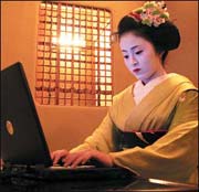 ايتشيمارو (18 عاماً) إحدى فتيات (الغيشا) وهو مسمى لفئة من الراقصات اليابانيات تستخدم كمبيوترها المحمول في الدخول إلى عالم الإنترنت. وفتيات الغيشا غالباً ما يكون همهن الرقص والترفيه ولكن للمرة الأولى فقد اقتحمن عالم الإنترنت بتكوين أول مدونة لهن في محاولة لنشر هذه الثقافة |