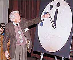 بالرغم من أن الموضوع رمزي تماماً لكنه حتماً يثير المخاوف، فقد قامت جماعة العلماء الذرّيين بتحريك عقرب الدقائق في ساعتها الخاصة بما أطلقوا عليه موعد نهاية العالم دقيقتين أقرب إلى منتصف الليل، ووفقا لهذه الساعة التي تبلغ 60 سنة، يعتبر منتصف الليل الدمار النووي، ونهاية الحياة كما نعرفها. |