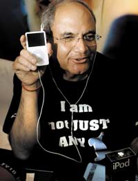 رئيس مجلس إدارة والمدير التنفيذي لشركة(HCL) لأنظمة المعلومات أجاي تشودهاري يستمع لأغنية من خلال جهاز الآي بود (iPOD) المنتج من قبل شركة آبل الإلكترونية بالعاصمة الهندية ........