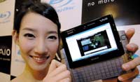 عارضة كورية جنوبية تستعرض منتج شركة سوني الجديد من أجهزة الكمبيوتر الجيبية( VGN-UX17LP) خلال حفل ترويجي أقيم في العاصمة الكورية الجنوبية، سيئول. ويزن هذا المنتج ........
