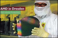 مدير مصنع (Fab 30) التابع لشركة(AMD) الأمريكية السيد بيتر جون يستعرض رقاقة إليكترونية مساحتها 300 ملم وذلك بمقر المصنع بمدينة دريسدن الألمانية.